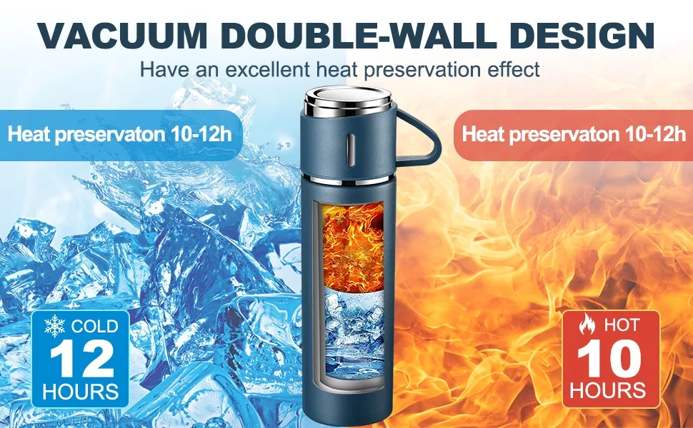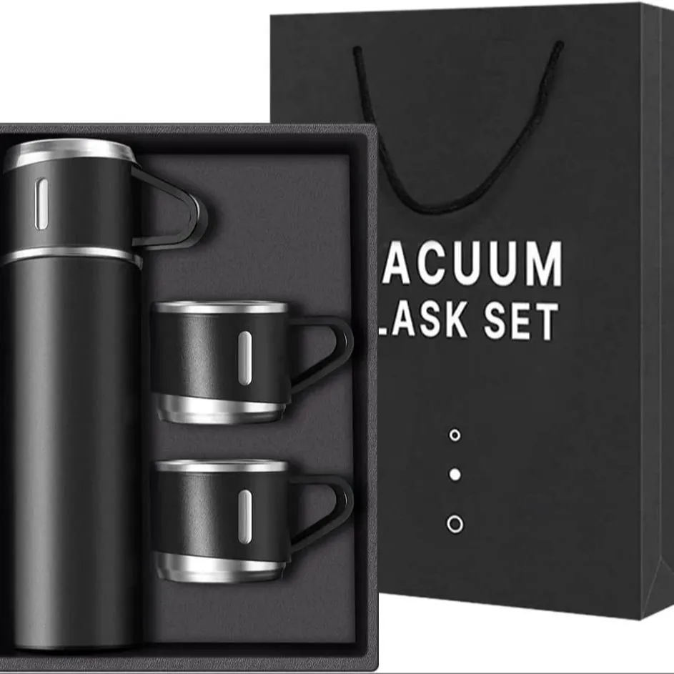 Vacuum Flask Set with 3 Cups Combo 500ml/16.9oz Vacuum Insulated Bottle with Cup Top Grade Stainless Steel Double Wall Insulated Thermos Travel Flask Bottle for Tea / Coffee / Water to keep Hot & Cold Up to 12 Hours suitable for Indoor or Outdoor Use